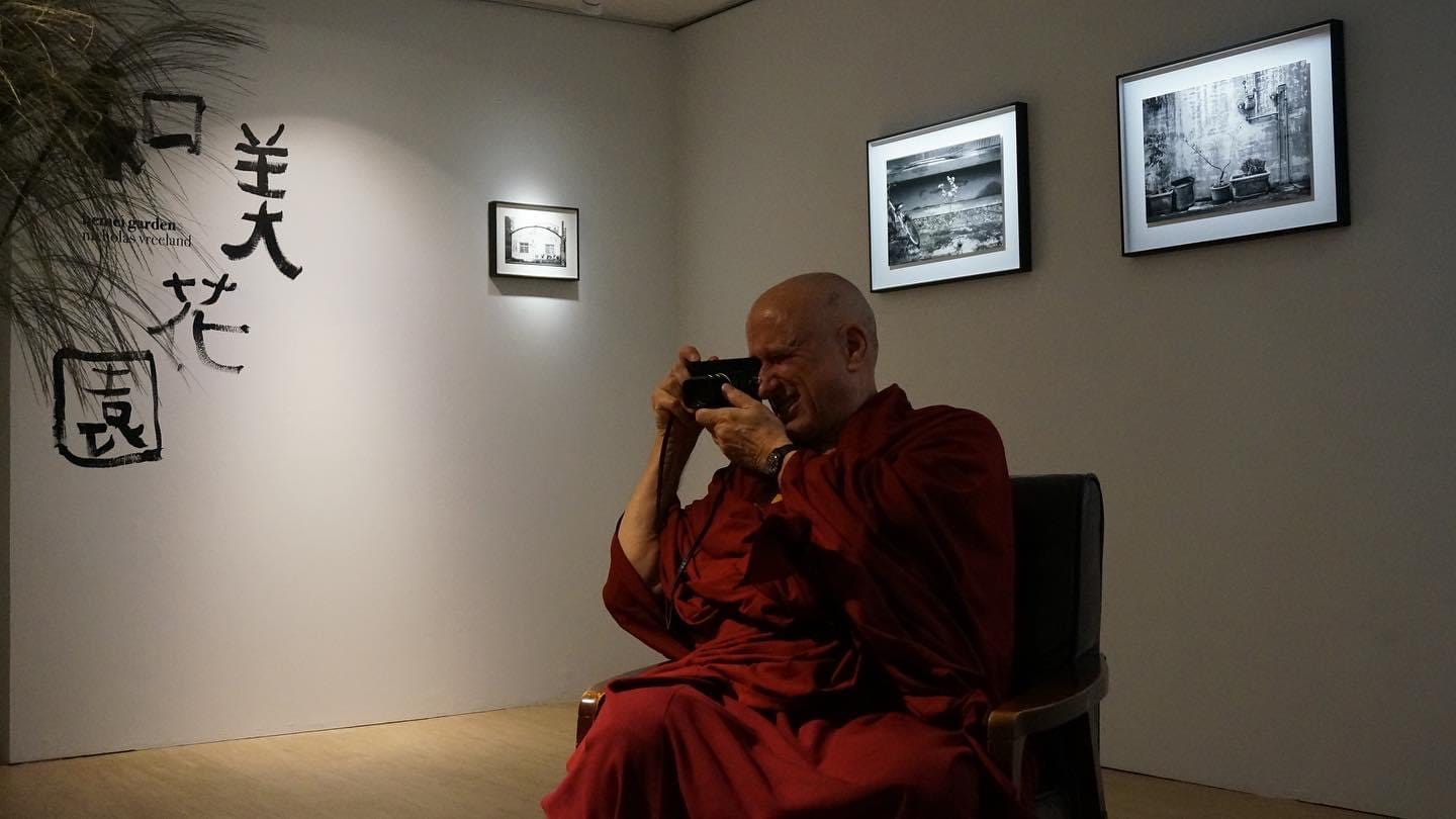 It’s the 10th year since Nicholas' documentary - Monk with a Camera was released. Therefore, there was a small group film viewing event at the venue where his latest photography works from Hemei, Changhua are displayed. After the film was played, he slowly walked down the stairs and greeted the guests.